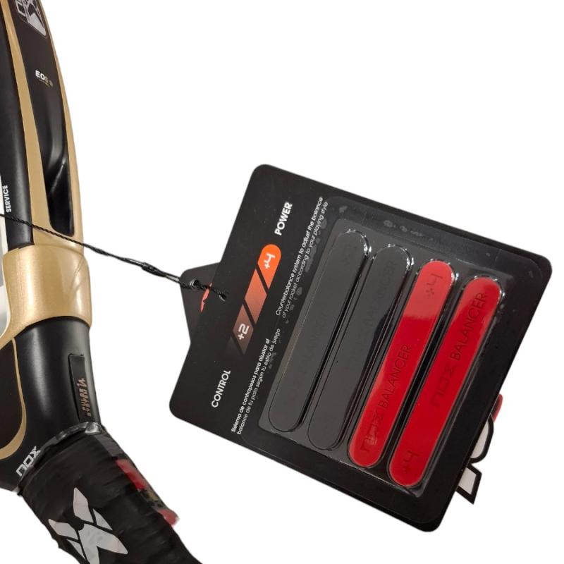 Sistema de contrapesos intercambiables que permite ajustar el peso y el balance de la pala según las preferencias del jugador. Incorpora piezas de 2g y 4g de fácil colocación y es compatible con el uso de protectores de marca.